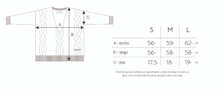 Sweater escote en V de moldería cuadrada. Tiene detalles de ochos en frente y una combinacion de hilados que hace a una prenda abrigada pero muy suave y cómoda al tacto con la piel. El largo modular es a la primera cadera.