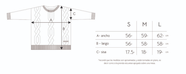 Sweater de moldería cuadrada y largo modular a la primera cadera. Tiene detalles de ochos en frente y una combinacion de hilados que hace a una prenda abrigada pero muy suave y cómoda al tacto con la piel. Punto acanalado en cuello, puños y cintura.